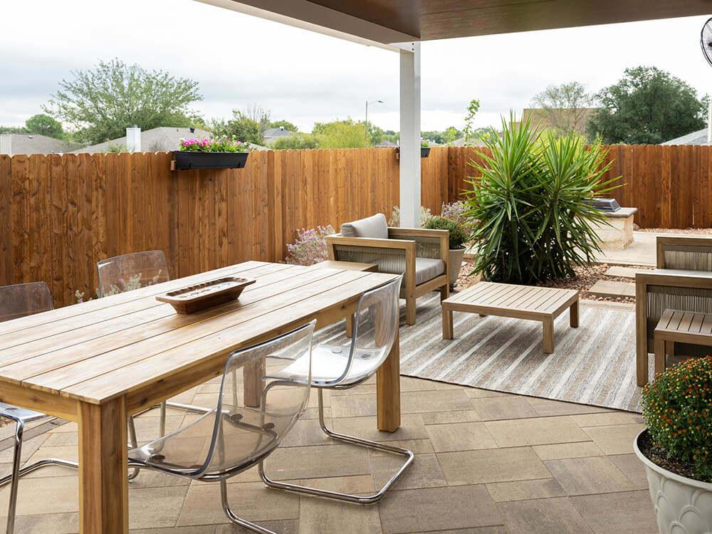 The Texas System Pavers' crew worked tirelessly to upgrade the Colon-Ruiz family's backyard. In one week, our team tore down a failing pergola, ripped up a cracked and faded concrete slab, and completely renovated the entire backyard space.